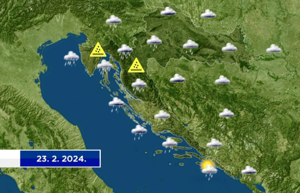 Petak će na sjevernom Jadranu i u Gorskoj Hrvatskoj biti još oblačniji, vjetrovitiji i kišovitiji od četvrtka pa su prognostičari DHMZ-a objavili upozorenje žutog - prvog stupnja zbog lokalno obilne kiše, te narančastog - drugog od 3 moguća stupnja zbog često olujnog juga, u gorju južnog i jugozapadnog vjetra. U najvišem gorju moguć je i snijeg. Temperatura zraka tijekom dana bez znatnije promjene - uz more od 10 do 15 °C, u unutrašnjosti 6 do 11 °C.