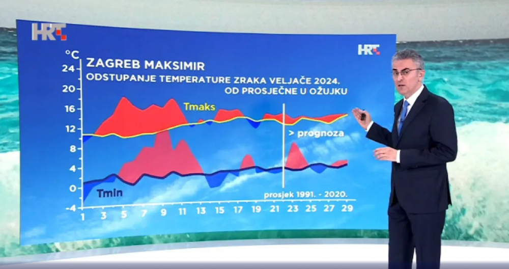 Samo malo niža u središnjoj Hrvatskoj, premda uz prevladavajuće oblačno vrijeme, te često umjeren, osobito u gorju i jak južni i jugozapadni vjetar. Povremena kiša vjerojatnija je popodne i osobito navečer.